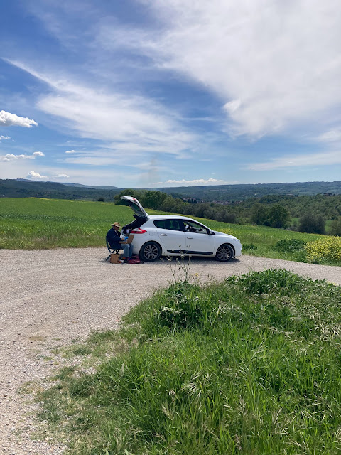 On yet another day...a really nice sunny and warm day...we were lucky to join pals on their boat and go out to one of the islands on the big lake, Lago Trasimeno. There is a sweet little church there that Johnny stopped and painted.